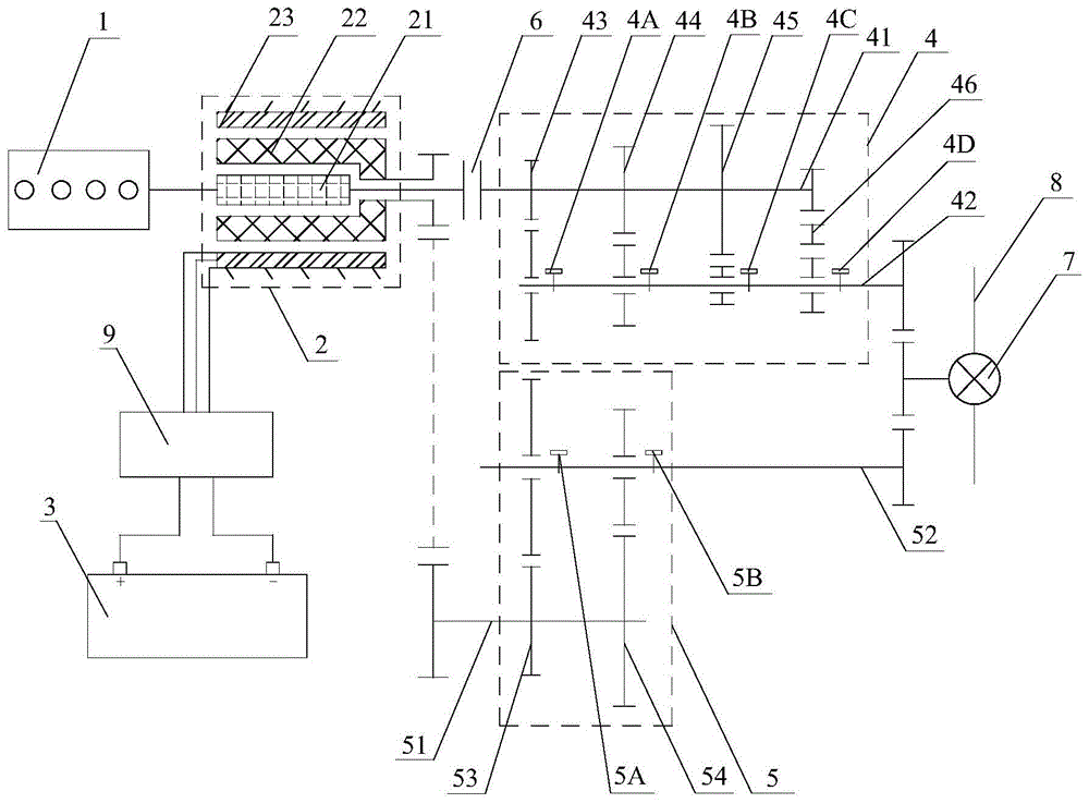 When the vehicle is in a gear shifting condition, two conditions are divided: in the first case, when the first transmission 4 is shifted, the power required by the vehicle can be provided by the battery pack 3 driving the outer rotor 22 of the dual mechanical port motor 2, and the engine 1 adjusts its rotation speed, so that the rotation speeds of the input shaft and the output shaft of the first transmission 4 are matched, and the first engaging sleeve 4A, the third engaging sleeve 4B, the fifth engaging sleeve 4C and the reverse engaging sleeve 4D of the first transmission 4 can be engaged smoothly to complete the shifting. The second situation is that the second transmission 5 shifts gears, and similarly, at this time, the power required by the vehicle can be completely provided by the engine 1, and the rotation speed of the outer rotor 22 of the dual mechanical port motor 2 is adjusted, so that the rotation speeds of the input shaft and the output shaft of the second transmission 5 are matched, and the second engaging sleeve 5A and the fourth engaging sleeve 5B of the second transmission 5 can be smoothly engaged to complete the shifting.