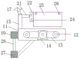 其中,所述取货板22的另一端固定连接有第三滑槽23,所述第三滑槽23的两侧上滑动连接有两个第三滑块24,两个所述第三滑块24的另一端上固定连接有夹紧板25,两个所述夹紧板25的内侧上端通过双向液压缸26固定相连,所述侧板20的上端固定连接有第一液压缸19,所述第一液压缸19上端固定连接有转动座18,所述转动座18的内部通过第一转轴3转动连接齿轮29,所述链条17的一端啮合传动连接在齿轮29上,所述第一传送带5的一端与第一电机6的输出端相连,所述第一电机6对应设置在第一输送座2的外部一侧上,所述第二输送座11的内部通过若干第二转轴12活动连接有若干输送轮4,且若干所述第二转轴12的一侧分别贯穿至第二输送座11的一侧通过第二传送带13传动相连,所述第二传送带13的一端通过第二电机14输出端固定相连,所述第二电机14设置在第二输送座11的外部一侧上。