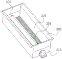 推料组件302包括外壳306和底盖307,底盖307一表面通过转轴308转动连接有五个齿轮309,五个齿轮309周侧面传动连接有一齿带310,齿带310与齿轮309啮合,其中一齿轮309一表面固定有一传动轴311,远离传动轴311的转轴308一端均贯穿底盖307且固定有一摆扇312;