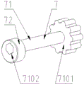 2. after passing through the transmission shaft 81, the output cams 82 are placed on the lower supporting surface 201 of the short support 2, at this time, because the number of the short supports 2 is two and the short supports are fixed along the front and rear parts of the fixed disc 1, the lower bottom surfaces of the output cams 82 are guaranteed to be positioned on the same plane, meanwhile, the relative positions of the lower output cams 82 on the transmission shaft 81 are guaranteed through the lower supporting surface 201 and the fixed holes 102, the inner distance between the upper output cams 82 and the lower output cams 82 is guaranteed through the lower support 6 arranged in the sliding holes 5101, and the upper output cams 82 are pressed through the pressing device 7, so that the axial directions and the circumferential directions of the output cams 82 are accurately positioned;