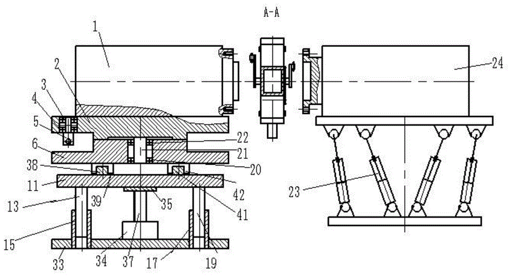 本发明的工作过程如下:启动第三伺服电机50通过第三减速器49带动横梁升降丝杠46反向旋转,横梁升降丝杠46的反向旋转通过横梁升降螺母45驱动测量机横梁44连同回字形支承框架70及其上安装的所有构件一同向下运动,当测量机横梁44和回字形支承框架70及其上安装的所有构件的最高点运动到六自由度平台23和矩形回转工作台2的上平面以下时,第三伺服电机50停止。用天车将发动机1吊装到矩形回转工作台2上平面的合适位置,用天车将传动箱24吊装到六自由度平台23上平面的合适位置。正向启动第三伺服电机50通过第三减速器49横梁升降丝杠46、横梁升降螺母45使测量机横梁44和回字形支承框架70及其上安装的所有构件向上运动到达测量位置:旋转轴81与发动机1的定位短圆柱面接近同轴。4个激光测距仪,即第一激光测距仪72、第二激光测距仪75、第三激光测距仪76、第四激光测距仪77同时工作,检测出即第一激光测距仪72、第二激光测距仪75、第三激光测距仪76、第四激光测距仪77所在平面与发动机1法兰平面的平行度误差,该两项误差数据实时输送到控制系统,控制系统输出指令,驱动第二伺服电机30、第五伺服电机68旋转带动矩形回转工作台2和十字叉架71转动,当即第一激光测距仪72、第二激光测距仪75、第三激光测距仪76、第四激光测距仪77所在平面与发动机2法兰平面的平行度误差小于设定值时,第二伺服电机30、第五伺服电机68停止。接着4个激光测距仪,即第五激光测距仪90、第六激光测距仪91、第七激光测距仪92、第八激光测距仪93同时工作,检测出第五激光测距仪90、第六激光测距仪91、第七激光测距仪92、第八激光测距仪93所在平面与传动箱24法兰平面的平行度误差,该两项误差数据实时输送到控制系统,控制系统输出指令,驱动六自由度平台23进行位姿调整,当第五激光测距仪90、第六激光测距仪91、第七激光测距仪92、第八激光测距仪93所在平面与传动箱24法兰平面的平行度误差小于设定值时六自由度平台23位姿调整结束;控制系统自动记录第一激光测距仪72、第二激光测距仪75、第三激光测距仪76、第四激光测距仪77所在平面与发动机1法兰平面的距离和第五激光测距仪90、第六激光测距仪91、第七激光测距仪92、第八激光测距仪93所在平面与传动箱24法兰平面的距离。正向启动第三伺服电机50通过第三减速器49横梁升降丝杠46、横梁升降螺母45使测量机横梁44和回字形支承框架70及其上安装的所有构件向上运动到达第二检测位置:外圆位移传感器86的测头高于发动机1定位短圆柱面上母线3~5mm左右,第三伺服电机50停止,启动第四伺服电机65通过第四减速器66、立柱移动丝杠63、立柱移动螺母62驱动测量机立柱53及与之相连的所有构件向左移动,当外圆位移传感器86的测头超过发动机1定位短圆柱面端面8mm左右时第四伺服电机65停止。重新启动第三伺服电机50,使外圆位移传感器86的测头下移5~8mm第三伺服电机50停止,启动第六伺服电机78通过小圆柱齿轮79、大圆柱齿轮80、旋转轴81、外圆检测支承板88、外圆检测支承架87带动外圆位移传感器86旋转,外圆位移传感器86的测量值实时输送给控制系统,控制系统发出指令使伺服电机和伺服电动推杆34启动,通过溜板6和升降台11带动发动机1作双向平移运动,直到发动机1定位短圆柱与旋转轴81的同轴度误差小于设定值,伺服电机和伺服电动推杆34停止。控制系统重新发出指令分别先后启动第三伺服电机50和第四伺服电机65使测量机横梁44和回字形支承框架70及其上安装的所有构件按原路返回到第二检测位置。启动第三伺服电机50测量机横梁44和回字形支承框架70及其上安装的所有构件向上运动到达第三检测位置:内孔位移传感器84的测头低于传动箱24定位短圆柱内孔母线3~5mm左右,第三伺服电机50停止。启动第四伺服电机65通过第四减速器66、立柱移动丝杠63、立柱移动螺母62驱动测量机立柱53及与之相连的所有构件向右移动,当内孔位移传感器84的测头到达传动箱24定位短圆柱内孔端面8mm左右时第四伺服电机65停止。重新启动第三伺服电机50,使内孔位移传感器84的测头上移5~8mm第三伺服电机50停止,启动第六伺服电机78通过小圆柱齿轮79、大圆柱齿轮80、旋转轴81、内孔检测支承板82、内孔检测支承架83带动内孔位移传感器84旋转,内孔位移传感器84的测量值实时输送给控制系统,控制系统发出指令驱动六自由度平台23作双向移动直到传动箱24的定位短圆柱内孔与旋转轴81的同轴度误差小于设定值,六自由度平台23停止。控制系统重新发出指令分别先后启动第三伺服电机50和第四伺服电机65使测量机横梁44和回字形支承框架70及其上安装的所有构件按原路返回到第三检测位置。启动第三伺服电机50使测量机横梁44和回字形支承框架70及其上安装的所有构件上升到上极限位置,启动六自由度平台23的驱动系统,使传动箱24向右移动直到发动机1和传动箱24的法兰面接触为止。人工安装并拧紧连接螺栓。The working process of the present invention is as follows: start the