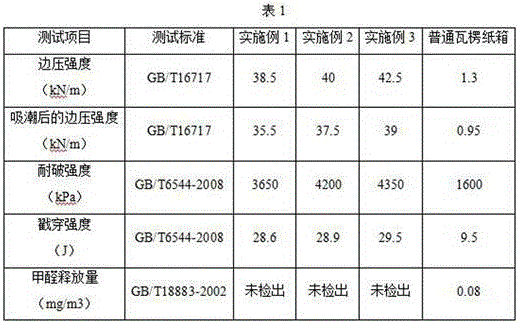 从上表可以看出,本发明的节能保温瓦楞纸箱具有以下优点:边压强度高,吸潮后的边压强度高,抗压强度好,防水防潮性好;耐破强度和戳穿强度高,力学性能优异,无甲醛释放,具有广阔的应用前景。