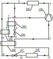 Three different working pressures exist in the whole system cycle working process of the invention, namely the condensing pressure of the condenser 102, the middle jet pressure of the compressor 101 and the evaporating pressure of the evaporator 108. Wherein the condensing pressure of the condenser 102 and the evaporating pressure of the evaporator 108 are determined by the working conditions of the circulating system (i.e. the condensing temperature at the outlet of the condenser 102 and the evaporating temperature at the outlet of the evaporator 108), which in turn depends on the temperature requirements of the air environment and the heated medium; the intermediate injection pressure of the compressor 101 is determined so as to maximize the heating coefficient of performance of the system.