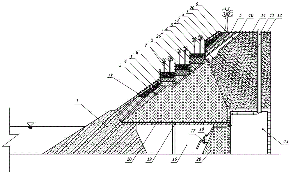 在梯级生物滞留净化池的内层下方和表层单元的内层下方铺设大面积砾石料渗滤层20,具有含水功能很渗滤功能,达到收集多余雨水并对其进行过滤作用。位于该大面积砾石料渗滤层20的底部开设有清水暗渠用于积蓄过滤雨水,当纤维层和大面积砾石料渗滤层20的含水达到饱和后,多余雨水向下流入清水暗渠中。可以在清水暗渠内安装有潜水泵,采用潜水泵通过抽水管将清水暗渠内积蓄储水引出。清水暗渠具有收集多余雨水的功能,也具有储水功能,可用于长期储水,而且能够通过水泵将储水引出至地表蓄水池,以提高地下暗渠的容纳功能。可见,雨水能够通过本发明的护坡,首先进入护坡表层的含水层,多余雨水能够进入大面积砾石料渗滤层20及其下方的清水暗渠中,从而能够应付汛期大量降水,能够吸存汛期雨洪资源,非汛期少量降水也能够被护坡表层的蓄水功能层吸收。A large-area gravel