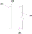 Advantageously, the blocking structure comprises vertical rods 107 fixed in the open cavity 108 and located at the left and lower sides of the rotating wheel 106, and a plate 201 for blocking seeds is fixed between the vertical rods 107, so that the seeds are blocked by the plate 201.
