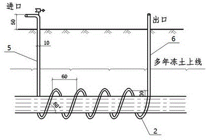 5、本发明的输油气管主要设置于地表以下,不对寒区脆弱生态环境产生任何影响,同时无需任何能源动力,充分达到人类工程活动与自然环境的和谐发展。5. The oil and gas pipeline of the present invention is mainly arranged below the surface, does not have any impact on the fragile ecological environment in the cold region, and at the same time does not require any energy and power, and fully achieves the harmonious development of human engineering activities and the natural environment.