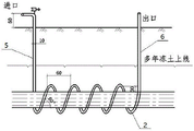 本具体实施首先在输油气管道外侧粘贴保温材料,阻止管道热量向周围土体传递;然后在管道周围设置螺旋式通风管,通过引出地面的竖向进风管道将气流引入螺旋式通风管,通风管内较冷气流通过管壁与管周土体发生热量交换,将输油气管道中正温介质通过管道释放到管周冻土的热量消耗掉,最后通过出风口将升温气流排出,通风管如此连续工作,不断降低通风管周围土体温度。该装置能保证输油气管道的热平衡状态,维持管周土体的冻结状态,起到稳定输油气管道的作用。该装置一方面阻隔管内正温输送介质向管周土体发生热量传递,另一方面通过螺旋式通风管在输油气管道周围土体形成一个的连续“冷环”,从而来平衡管道内传输介质放热,将输油气管道对周围土体的热影响控制在这一“冷环”范围内,起到保护管周冻结土体,稳定管道和防止病害发生等作用。In this specific implementation, firstly, a thermal insulation material is pasted on the outside of the oil and gas pipeline to prevent the heat transfer of the pipeline to the surrounding soil; then a spiral ventilation pipe is arranged around the pipeline, and the air flow is introduced into the spiral ventilation pipe through the vertical air inlet pipe leading out of the ground, and the ventilation is carried out. The cooler airflow in the pipe exchanges heat with the soil around the pipe through the pipe wall, and consumes the heat released by the normal temperature medium in the oil and gas pipeline to the frozen soil around the pipe through the pipe, and finally discharges the warm air through the air outlet. , and continuously reduce the soil temperature around the ventilation pipe. The device can ensure the thermal balance state of the oil and gas pipeline, maintain the frozen state of the soil around the pipeline, and play the role of stabilizing the oil and gas pipeline. On the one hand, the device blocks the heat transfer from the positive temperature conveying medium in the pipe to the surrounding soil, and on the other hand forms a continuous "cold ring" around the soil around the oil and gas pipeline through the spiral ventilation pipe, so as to balance the transmission medium in the pipeline. Release heat, control the thermal impact of oil and gas pipelines on the surrounding soil within this "cold ring" range, and play the role of protecting the frozen soil around the pipe, stabilizing the pipeline and preventing the occurrence of diseases.