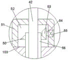 In addition, in one embodiment, the extruding device 103 includes an extruding motor 55 fixedly installed in the driving tank 52, a stub shaft 54 is connected to the extruding motor 55, a first bevel gear 53 is fixedly installed on the stub shaft 54, a lead screw 56 slidably connected to the main shaft 42 is rotatably connected to the bottom wall of the driving tank 52 and the top wall of the processing tank 70, a second bevel gear 50 engaged with the first bevel gear 53 is fixedly installed on the lead screw 56, a screw block 66 is threadedly connected to the processing tank 70 by the lead screw 56, the screw block 66 is slidably connected to the inner wall of the stirring tank 68, a slide rod 67 slidably connected to the screw block 66 is fixedly installed on the top wall of the processing tank 70, and when the extruding motor 55 is turned on, the first bevel gear 53, the second bevel gear 50 and the lead screw 56 are driven to rotate, so that the screw block 66 moves downward, the material in the process tank 70 may be extruded downward.