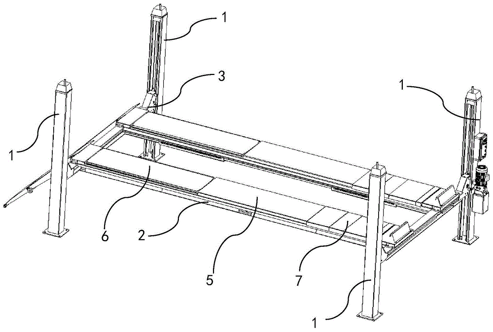 In this embodiment, as shown in fig. 1 and 11, the four-column lifting mechanism of the present invention includes an upper carriage plate assembly and two folding lifting structures 5, the upper carriage plate assembly is located at the side of the first supporting platform 2, and the two folding lifting structures 5 are symmetrically arranged with respect to the longitudinal center line of the first supporting platform 2;