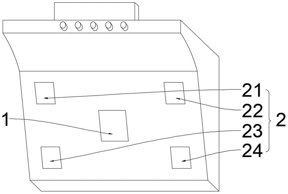 需要说明的是,结合图3所示,当侧方进烟口2的数量为多个时,还需要检测多个侧方进烟口烟雾浓度Cb,并通过数据处理模块计算得出多个所述侧方进烟口烟雾浓度Cb中的最大侧方进烟口烟雾浓度Cbmax,根据所述中央进烟口烟雾浓度Ca、最大侧方进烟口烟雾浓度Cbmax、所述第一阈值C1与所述第二阈值C2,对当前吸油烟机的风速档位进行控制,并且第一阈值C1大于第二阈值C2。It should be noted that, with reference to Fig. 3, when the number of