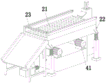 The conveying member 21 comprises a conveying screen plate 211, a conveying plate 212, two partition plates 213 and four supporting seats 214, the four supporting seats 214 are arranged in a rectangular array, the top of each supporting seat 214 is provided with a vibration spring 216, the top of each vibration spring 216 is provided with a connecting block 215, the conveying plate 212 is arranged on the four connecting blocks 215, the conveying plate 212 is provided with a conveying cavity 2141, the conveying screen plate 211 is horizontally arranged on the conveying plate 212, the two partition plates 213 are symmetrically arranged on the top of the conveying screen plate 211, and the bottom of the conveying plate 212 is provided with a collecting cover 217 communicated with the conveying cavity 2141; on carrying metallurgical material to carrying otter board 211, two rotate the piece 41 and rotate and remove the metallurgical material on carrying otter board 211, at the in-process that metallurgical material removed, the effect of vibrations spring 216 plays the effect of connecting and vibrations at the in-process of vibrations, when screening metallurgical material, dust in the metallurgical material will fall into in the transport chamber 2141.