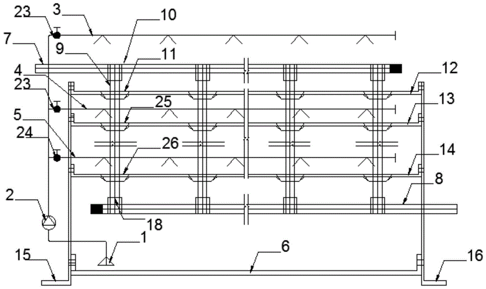 板式结构水膜重构系统由多个平行设置的布水槽28构成,布水槽28数量与单元盘管9的数量相同,每个布水槽28上设置以单元盘管9中心线为对称轴、坡向单元盘管9的板式汇水槽19,板式汇水槽19与单元盘管9间设置板式出水口30。The plate structure water film reconstruction system is composed of a plurality of