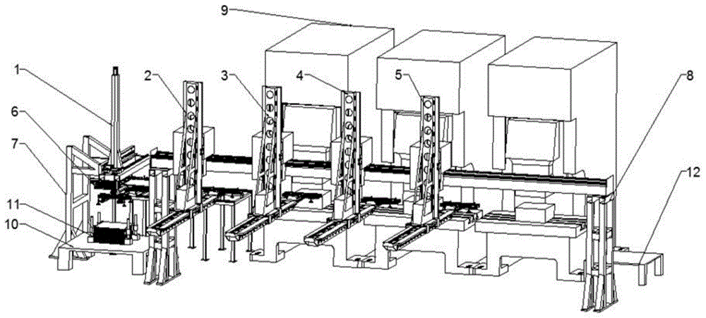 Currently, some automatic feeding devices are already on the market. For example, chinese patent document CN201969797U discloses an automatic feeding device for a press machine, which includes a press machine, a press head on the press machine, a die plate matched with the press head, and a feeding device linked with the press head, wherein the feeding device includes a reciprocating feeding rod for pushing a die material to a position on the die plate corresponding to the press head, and a driving device for driving the feeding rod to reciprocate; and a guide groove for die material is arranged between the corresponding position of the punch head on the die plate and the feeding rod. The feeding rod of the feeding device can push the die material placed at a safe position to the corresponding position of the punch head on the die plate through the guide groove, so that continuous and safe operation of small workpieces is realized. However, this loading apparatus is suitable for single press process operation, and multi-process continuous operation of a plurality of presses cannot be realized.