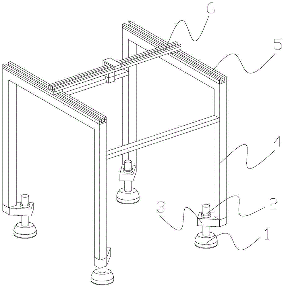 In the figure: a supporting leg-1, an adjusting rod-2, a supporting block-3, a supporting frame-4, a transverse track-5, a movement detection structure-6, a transverse sliding structure-61, a longitudinal track structure-62, a movement detection structure-63, a sliding block-611, a side rolling ball-612, an upper rolling ball-613, a sliding plate-614, a rotating shaft-615, a guide rail-621, an extension structure-622, a bottom plate-623, a sliding groove-22 a, a limiting plate-22 b, an end cover-22 c, an extension plate-22 d, a movable block-631, a side plate-632, a connecting plate-633, a detection structure-634, a distance sensor-34 a, a supporting plate-34 b, a rotating shaft-34 c, a limiting structure-34 d, a turntable-4 d1, a positioning device-34 b, a positioning device-615, a positioning device-24, a positioning device and a positioning device, A latch-4 d2, a pressing block-4 d3, a fixed rod-4 d4, a spring-4 d5 and a clapboard-d 10.