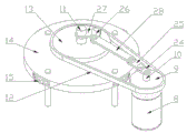 As a further scheme of the invention: the motor is installed to the motor incasement, and the main shaft and the first pivot of motor are connected, install first belt pulley in the first pivot, the transmission case middle part is provided with the second pivot, installs the second belt pulley in the second pivot, and first belt pulley passes through the belt and is connected with the second belt pulley, second belt pulley below is provided with the carousel, carousel and second belt pulley fixed connection install a plurality of third pivot in the carousel.