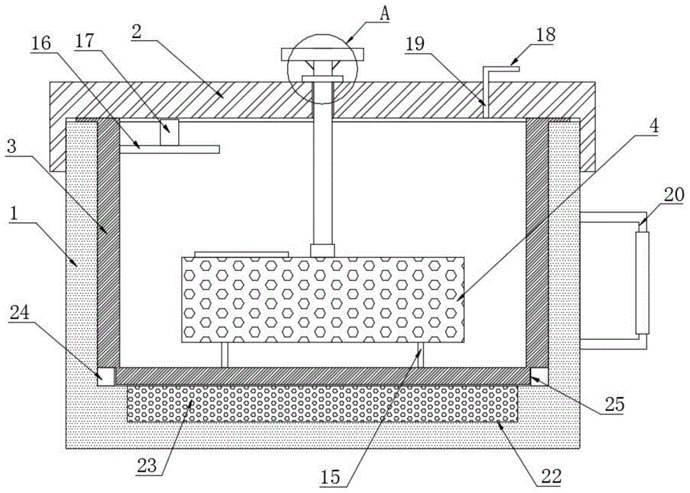 Further, a placing groove 22 is arranged at the bottom of the inner cavity of the box body 1, and a heater 23 is arranged inside the placing groove 22.