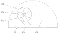 1. a purification device; 101. a housing; 102. a guide plate; 103. ash leakage holes; 104. a buffer chamber; 105. a volute cavity; 106. a return orifice; 107. a blower; 108. an air duct; 109. an arc-shaped plate; 110. a dust filter screen; 2. a drive device; 21. a buffer water tank; 22. a water receiving hole; 23. a water guide plate; 24. a dust concentration sensor switch; 25. a booster pump; 26. a water delivery pipe; 27. a fixing plate; 28. a tap water pipe; 3. an ash receiving device; 31. triangular bars; 32. a bearing plate; 33. fixing the suspender; 34. an ash receiving plate; 35. penetrating the gap; 36. inserting the gaps; 4. a material blocking device; 41. an arc-shaped cylinder; 42. ejecting a spring; 43. a piston block; 44. an arcuate bar; 45. a striker plate; 5. a dust pushing device; 51. positioning blocks; 52. a sliding cylinder; 53. fixing the sliding rod; 54. pushing the knife; 55. a semicircular plate; 56. a stress plate; 57. a guide slide bar; 58. a restoring spring; 6. a transmission device; 601. rotating the tube; 602. water wheel blades; 603. a first adapter tube; 604. a first sleeve; 605. a first annular flat tube; 606. a first spray head; 607. a second adapter tube; 608. a second sleeve; 609. a second annular flat tube; 610. a second spray head; 7. a dust scraping device; 71. a movable rod; 72. a limiting arc plate; 73. a drive plate; 74. a force application spring; 75. a force application arc plate; 76. an ash accumulation box; 77. a dust scraping blade; 78. draining holes; 8. a fluid infusion control device; 801. a control valve body; 802. fixing grooves; 803. a tapered groove; 804. a flow channel; 805. a liquid supplementing pipe; 806. fixing the sleeve; 807. a control spring; 808. a piston plate; 809. a piston post; 810. a conical piston; 811. a drive rope; 812. a gravity ball.
