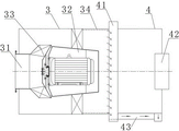 As shown in fig. 2, the flue gas washing purifier 3 comprises a flue gas washing cylinder, the cyclone dehydrator 4 comprises a dehydrator cylinder, a gas washing machine 32 is installed in the flue gas washing purifier 3, the gas washing machine 32 has a centrifugal impeller 33, the centrifugal impeller 33 of the gas washing machine 32 corresponds to a smoke inlet B31, one end of the flue gas washing cylinder far away from the smoke inlet B31 is a smoke outlet B, the dehydrator cylinder has an air inlet end a and an air outlet end a, the smoke outlet B of the flue gas washing cylinder is communicated with the air inlet end a of the dehydrator cylinder, the air outlet end a of the dehydrator cylinder has an air outlet 42, and the air outlet 42 of the dehydrator cylinder is communicated with the electrostatic precipitator 5. The flue gas washing barrel is provided with a water flow inner side wall area 34 on one side close to the flue gas outlet B, an annular drainage ditch 41 corresponding to the water flow inner side wall area 34 is installed at one end part of the dehydrator barrel close to the air inlet end A, an axial drainage channel 43 is arranged on the inner side wall of the dehydrator barrel, a water outlet (the water outlet is the water outlet of the cyclone dehydrator 4) is arranged at one end part of the dehydrator barrel close to the air outlet 42, one end part of the axial drainage channel 43 is communicated with the annular drainage ditch 41, and the other end part of the axial drainage channel 43 is communicated with the water. An exhaust fan is disposed in the preferred exhaust port 42 of the present invention.