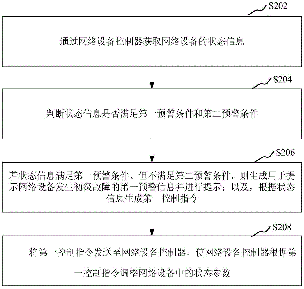 通过网络设备控制器获取网络设备的状态信息;判断状态信息是否满足第一预警条件和第二预警条件;若状态信息满足第一预警条件、但不满足第二预警条件,则生成用于提示网络设备发生初级故障的第一预警信息并进行提示;以及,根据状态信息生成第一控制指令;将第一控制指令发送至网络设备控制器,使网络设备控制器根据第一控制指令调整网络设备中的状态参数。Obtain the status information of the network device through the network device controller; determine whether the status information satisfies the first warning condition and the second warning condition; First warning information of the primary failure of the device and prompting; and, generating a first control command according to the status information; sending the first control command to the network device controller, so that the network device controller adjusts the network device according to the first control command. state parameter.