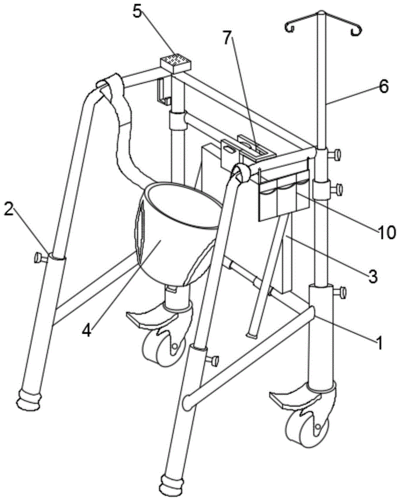 图中,1-右侧支架,11-右前腿,111-右上前腿,112-右下前腿,1111-输液槽,12-右扶手,121-右固定通孔,13-右后腿,131-右上后腿,132-右下后腿,14-下横梁,15-中横梁,151-右套管,152-左套管,16-上横梁,17-右横梁,18-左横梁,19-万向轮,2-左侧支架,21-左前腿,211-左上前腿,212-左下前腿,22-左扶手,221-左固定通孔,23-左后腿,231-左上后腿,232-左下后腿,3-座椅垫,31-座椅支脚,4-防护三角裤,41-前片,411-调节带,412-子扣,42-裆片,43-后片,431-固定带,432-母扣,5-警报铃,6-输液架,7-固定夹,71-前夹片,72-后夹片,73-连接柱,74-把手,8-挂钩,9-紧固螺栓,10-放物袋。In the figure, 1-right bracket, 11-right front leg, 111-right upper front leg, 112-right lower front leg, 1111-infusion tank, 12-right armrest, 121-right fixing through hole, 13-right rear leg, 131-right upper rear leg, 132-right lower rear leg, 14-lower beam, 15-middle beam, 151-right casing, 152-left casing, 16-upper beam, 17-right beam, 18-left beam, 19-Universal wheel, 2-left bracket, 21-left front leg, 211-left upper front leg, 212-left lower front leg, 22-left armrest, 221-left fixing through hole, 23-left rear leg, 231-left upper Rear Leg, 232- Lower Left Rear Leg, 3- Seat Pad, 31- Seat Feet, 4- Protective Briefs, 41- Front Piece, 411- Adjustment Belt, 412- Zigzag, 42- Crotch Piece, 43- Rear Piece, 431-Fixing Strap, 432-Female Buckle, 5-Alarm Bell, 6-Infusion Pole, 7-Fixing Clip, 71-Front Clip, 72-Rear Clip, 73-Connecting Post, 74-Handle, 8- Hook, 9-fastening bolts, 10-putting bag.