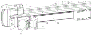 如图4所示,待测产品移动平台7包括第一垂直夹爪71、第一夹爪夹放气缸72、第一夹爪升降气缸73、第一移动部74、第一夹爪驱动装置以及第一滑台75,第一垂直夹爪71安装在第一移动部上并且在第一夹爪驱动装置作用下在第一滑台75上做直线移动来回于待测产品输送平台1与图像采集旋转平台4之间;第一夹爪夹放气缸72作用第一垂直夹爪71使得其抓取或放下待测产品;第一夹爪升降气缸73与第一垂直夹爪71连接使得第一垂直夹爪71做垂直方向移动。As shown in FIG. 4 , the moving platform 7 of the product to be tested includes a first vertical clamping