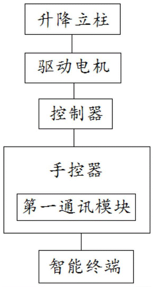 本发明的基本思想是手控器通过第一通讯模块接收智能终端发送的身份验证指令,在身份验证指令验证通过后,通过第一通讯模块接收智能终端发送的升降桌设定高度数据,并根据升降桌设定高度数据发送控制指令到控制器,所述控制器根据控制指令对驱动电机发送驱动指令实现升降立柱的高度调节。一方面,只有在身份验证之后才能实现升降桌的高度调节,另一方面,在身份验证之后能够根据升降桌设定高度数据实现升降桌高度的自动调节。The basic idea of the present invention is that the hand controller receives the identity verification instruction sent by the intelligent terminal through the first communication module, and after the authentication of the identity verification instruction is passed, the first communication module receives the setting height data of the lifting table sent by the intelligent terminal, and according to The height setting data of the lifting table sends a control command to the controller, and the controller sends a driving command to the driving motor according to the control command to realize the height adjustment of the lifting column. On the one hand, the height adjustment of the elevating table can only be realized after authentication; on the other hand, after the authentication, the height of the elevating table can be automatically adjusted according to the set height data of the elevating table.