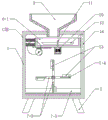 the device comprises a box body 1, support legs 2, a feeding pipe 3, a discharging pipe 4, a sealing plug 5, a first mixing mechanism 6, a mixing pool 6-1, a spring 6-2, a rack 6-3, a half gear 6-4, a rotating rod 6-5, a sliding rail 6-6, a sliding block 6-7, a first motor 6-8, a round hole 6-9, a second mixing mechanism 7, a second motor 7-1, a stirring shaft 7-2, a connecting rod 7-3, a stirring plate 7-4, a guide plate 7-5, a vacuum powder conveyor 8, a protective cover 9, a third motor 10, a rotating shaft 11, a stirring blade 12, a scraping plate 13, a door body 14, a pushing plate 15, an inserted rod 16 and a sleeve 17.