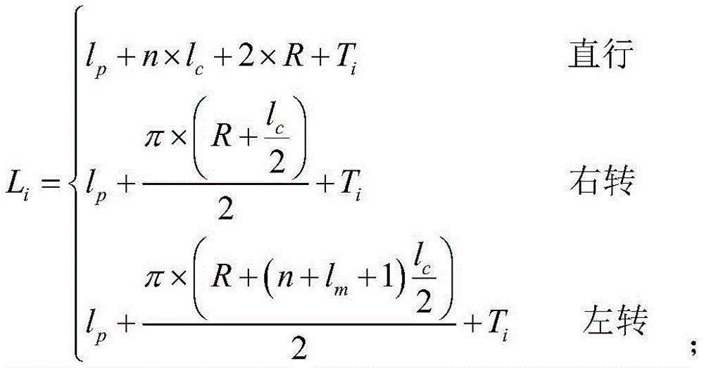 (1) the link numbers are numbered in sequence from the first link of the recommended route, the link numbers are respectively 1,2 and 3 … i … n, n is the last link of the recommended route, and the link length is LiRepresenting the distance traveled from the sidewalk of section i-1 to the sidewalk of section i, each lane width lcWidth of sidewalk lpRadius of curve R, length of straight line section of roadiNumber of lanes n, width of isolation belt lmThe running of the sample vehicle is divided into straight running, left turning and right turning, and the length expression of each road section is as follows: