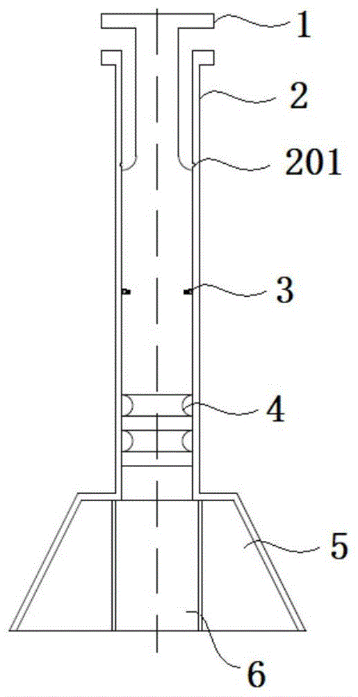 所述抽取部1包括拉伸连杆和设于拉伸连杆底部的密封部4,所述拉伸连杆安装于测量部2的内部,所述密封部4的侧壁与测量部2的内侧壁相贴合,并可沿着测量部2的内侧壁进行滑动。同时,所述密封部4为密封活塞,该密封活塞的侧壁与测量部的内侧壁紧密贴合,密封效果优良,不易造成气体逸出,测量微量气体体积时更精确。另外,该抽取部1的拉伸连杆上加工有锁紧部3,测量部2内侧壁上设有与所述锁紧部3相匹配的卡口201,用于对抽取部1进行锁定。The