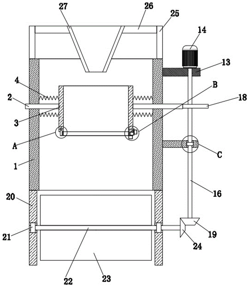 图中:1、处理箱;2、滑板;3、盒体;4、第一弹簧;5、转轴;6、转板;7、密封板;8、筛板;9、牵引板;10、拉板;11、限定板;12、第二弹簧;13、安装板;14、驱动电机;15、侧板;16、驱动轴;17、第一轴承;18、凸轮;19、第一锥形齿轮;20、支撑板;21、第二轴承;22、横轴;23、推沙板;24、第二锥形齿轮;25、竖板;26、横板;27、进料斗。In the figure: 1, processing box; 2, slide plate; 3, box body; 4, first spring; 5, rotating shaft; 6, rotating plate; 7, sealing plate; 8, screen plate; 9, traction plate; 10, pull plate; 11, limiting plate; 12, second spring; 13, mounting plate; 14, drive motor; 15, side plate; 16, drive shaft; 17, first bearing; 18, cam; 19,