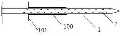 步骤二:所述初期支护包括钢拱5,将超前小导管1穿过钢拱,所述多个沿着洞口方向的钢拱组成钢拱支撑;另外,为了避免采用超前小导管1进行注浆操作时,出现漏浆的情况,可以对未插入超前小导管的部分设置套筒,套筒可以滑动,套筒远离插入头设置圆盘101,圆盘101能够带着套筒100在使用的过程中滑动,套筒100也可以部分插入围岩6,这里减少未插入部分出现漏浆的现象。因此该结构的设置可以避免注浆不能达到预期效果时围岩变形难以控制的情况出现。