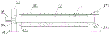 请参阅图5-6,位于左侧的承接板91外端安装有第二电动机16,本领域技术人员可采用合适型号的第二电动机16,例如WL-25RS370有刷直流电动机,第二电动机16的输出端贯穿承接板91左端且与定位柱92固定连接,位于右侧的承接板91外端设有外套管151,外套管151位于擦拭棉布93的外侧,外套管151外端开凿有限位孔152,擦拭棉布93位于外套管151内的部分处于压缩状态,当擦拭棉布93使用一段时间后,擦拭棉布93表面较脏,在下雨天时,配合雨水的作用,对擦拭棉布93进行清洗工作,工作人员可手动启动第二电动机16,使第二电动机16带动定位柱92和擦拭棉布93顺时针或逆时针转动,擦拭棉布93转动过程中,擦拭棉布93的不同部位交替露出限位孔152外,擦拭棉布93与外套管151内壁摩擦,而将脏水不断挤出,擦拭棉布93转动多个周期后,可清洗较为干净。Please refer to FIGS. 5-6 , a