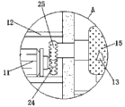 1. The utility model provides a rubble device for building, includes supporting baseplate (2), damping spring (6), fan (9), blade (13) and dust removal pump (19), its characterized in that: equidistant damping spring (6) is installed at the top of supporting base plate (2), damping plate (3) is fixed at one end of damping spring (6), device shell (7) is fixed at the top end of supporting base plate (2), partition plate (5) is fixed on the inner side wall of the bottom of device shell (7), first motor (4) is installed at the bottom of device shell (7) below partition plate (5), the output end of first motor (4) is provided with a rotating shaft through a coupler, the rotating shaft penetrates through partition plate (5) and is provided with spiral crushing paddle (16), a broken stone roller (15) is arranged inside device shell (7) above spiral crushing paddle (16), equidistant blades (13) are welded on the outer side wall of broken stone roller (15), one end of broken stone roller (15) penetrates through device shell (7) and is provided with crushing gear (25), a protective cover (12) is fixed on the outer wall of one side of the device shell (7), a second motor (11) is arranged in the protective cover (12), the output end of the second motor (11) is provided with a rotating rod through a coupler, one end of the rotating rod far away from the second motor (11) is provided with a rotating gear (24), and the rotating gear (24) is meshed with the crushing gear (25), the top end of the supporting bottom plate (2) at one side of the device shell (7) far away from the second motor (11) is fixed with a dust removing box (20), the inner side wall of the dust removing box (20) is provided with a filter screen (21), a control panel (23) is arranged on the outer wall of one side of the device shell (7), and the output end of the singlechip in the control panel (23) is respectively electrically connected with the input ends of the first motor (4) and the second motor (11), and a discharge door body (22) is arranged on the outer wall of the device shell (7) below the control panel (23).