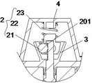 参见图7所示,卡合结构2包括与卡槽201相匹配卡合的卡紧件21、限定卡紧件21的限定件22;限定件22的结构与第一个实施例中的基本相同,区别在于输出轴20的上端位于容纳腔220内,因而在容纳腔220的顶部可以不开设通孔。Referring to Fig. 7, the engaging