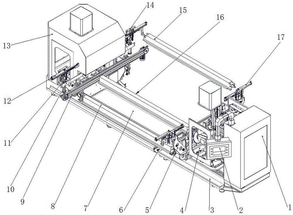 如图1-4所示的铝合金型材双头数控端面铣,主要由机架7、右机头4、左机头11、右拖料装置6、左拖料装置12、右托料装置5、左托料装置9、右推料装置17、左推料装置14组成,机架7采用优质碳素结构钢的矩形管焊接而成并经酸洗磷化和人工时效处理,具有高强度及高稳定性,机架7长度沿左右方向分布,机架7上设置有长度沿左右方向横向分布的导轨,右机头4和左机头11通过第一导轨副24左右滑动连接于机架7的左右两端,右机头4和左机头11上均设置有机头罩13, 此外,机架7的右端还设置有电控箱1,电控箱1上设置有操作箱2,在机架7的四周设置有用于走线的拖链盒3,右机头4与机架7之间还设置有位置调节装置,主要由调节气缸19、铰接轴18以及调节气缸安装座20组成,调节气缸19活塞杆一端通过铰接轴18与右机头4下端铰接,缸体一端通过调节气缸安装座20与机架7固定相连,在调节气缸20的带动下,右机头4可以沿着第一导轨副24左右移动一定距离,而左机头11则通过齿轮齿条机构驱动,具体的,齿轮齿条驱动结构由齿条21、传动齿轮22、第一伺服电机23组成,第一伺服电机23固定连接于左机头11的下方,齿条21固定在机架7的前端并且长度沿机架7的长度方向分布,第一伺服电机23动力输出轴连接有传动齿轮22,传动齿轮22与齿条21啮合相连,通过第一伺服电机23带动右机头沿着第一导轨副24左右滑动,从而方便根据待铣削型材长度左右移动,并且在右机头4与机架7之间、左机头11与机架7之间均设置有钳制器25用于紧急刹车,方便对型材进行锁紧。As shown in Figure 1-4, the double-head CNC face milling of aluminum alloy profiles is mainly composed of a