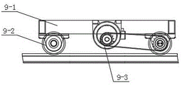 运料车9包括车架9-1,车架9-1的下部两侧均转动连接有旋转轴,每一根旋转轴的两端均设有与轨道适配的车轮9-2,车架9-1的下部中部设有驱动其中一根旋转轴旋转的驱动装置9-3,驱动装置9-3包括与车架9-1固定连接的电机,电机通过链轮、链条驱动旋转轴旋转;用于运送待加工铅锭或者输送已加工铅锭;