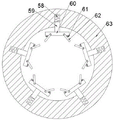 有益地,所述输送装置79包括转动安装在所述第一固定体63中的定位环57,所述定位环57上固设有带轮环53,所述带轮环53中滑动连接有六个圆周分布的伸缩杆55,每个所述伸缩杆55上连接有压缩弹簧54,所述伸缩杆55下侧转动连接有紧固轮56,所述带轮环53中滑动连接有五个圆周分布的打磨杆59,每个所述打磨杆59上连接有打磨弹簧58,所述打磨杆59上固设有固定打磨板60,每个所述固定打磨板60两侧转动连接有活动弹簧62,所述活动弹簧62与所述固定打磨板60之间连接有活动打磨板61,所述固定打磨板60和所述活动弹簧62打磨树木表面,从而当树木继续向右移动进入所述第一固定体63中时,所述主动锥齿轮14带动所述正转锥齿轮15和所述正转带轮18转动,所述正转带轮18带动所述带轮环53转动,所述紧固轮56旋转,所述压缩弹簧54使所述紧固轮56紧贴夹紧树木,所述紧固轮56带动树木一起旋转,所述带轮环53和所述齿轮环43转动方向相反,所述打磨弹簧58使所述固定打磨板60紧贴树木,所述活动打磨板61使所述活动弹簧62紧贴树木,所述固定打磨板60和所述活动弹簧62相对树木转动,并磨削树木表面,使树木表面光滑。