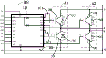 其中,该第二绝缘栅双极型晶体管30以及该第一绝缘栅双极型晶体管20组成一个全桥电路A1。该第三绝缘栅双极型晶体管40以及该第四绝缘栅双极型晶体管50组成一个全桥电路A2。全桥电路A1中的第一绝缘栅双极型晶体管20和第二绝缘栅双极型晶体管30只能择一导通;全桥电路A2中的第三绝缘栅双极型晶体管40和第四绝缘栅双极型晶体管50也只能择一导通。因此,第一绝缘栅双极型晶体管20和第四绝缘栅双极型晶体管50构成一组通路,由同一组信号驱动,同时导通/关断;第三绝缘栅双极型晶体管40和第二绝缘栅双极型晶体管30构成另一组通路,由同一组信号驱动,同时导通/关断。The second insulated gate bipolar transistor 30 and the first insulated gate