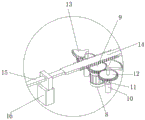 在U型滑座5前后两端侧板的内侧面上端均设置有滑轨槽501,U型滑座5的上表面中心处设置有本设备的进给系统,参考附图5,其包括竖向固定设置的驱动电机8,可选用型号为YDS132的低速电机,在驱动电机8的输出轴上连接有主动齿轮9,位于驱动电机8的前后两侧均设置有转筒10,转筒10中转动设置有转轴11,在转轴11的上均设置有从动齿轮12,并将两个从动齿轮12与主动齿轮11的前后齿面相啮合,其两个从动齿轮12在主动齿轮的作用下转向相反,两个转轴11的顶端均设置有扇形齿轮13,两个扇形齿轮13的齿面方向相反设置。在两个扇形齿轮13之间设置有双面齿条14,其双面齿条14的两个齿面可与两个扇形齿轮13相啮合。在双面齿条14的两端设置有滑杆15,位于驱动电机8的左右两侧设置有固定块16,固定块上16开设有与滑杆15相配合的滑孔,并在滑杆15的端部均连接有梯形块17,位于梯形块17的前后端均设置有转动杠杆18,在靠近梯形块1/3处的转动杠杆18下方设置有立杆19,其转动杠杆18与立杆18转动连接,在转动杠杆18的外端连接有弧形顶块20。