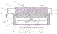 所述U型滑座前后两端侧板的内侧面上端均设置有滑轨槽,所述U型滑座的上表面中心处设置有驱动电机,所述驱动电机的输出轴上连接有主动齿轮,位于所述驱动电机的前后两侧均设置有转筒,所述转筒中转动设置有转轴,所述转轴的上均设置有从动齿轮,两个所述从动齿轮与主动齿轮的前后齿面相啮合,两个所述转轴的顶端均设置有扇形齿轮,两个所述扇形齿轮的齿面方向相反,两个所述扇形齿轮之间设置有双面齿条,所述双面齿条的两端设置有滑杆,位于所述驱动电机的左右两侧设置有固定块,所述固定块上开设有与滑杆相配合的滑孔,所述滑杆的端部均连接有梯形块,位于所述梯形块的前后端均设置有转动杠杆,靠近所述梯形块处的转动杠杆下方设置有立杆,所述转动杠杆与立杆转动连接,所述转动杠杆的外端连接有弧形顶块,所述U型滑座的上方设置有工作台,所述工作台的下表面前后两端均焊接有滑轨,所述滑轨设置在滑轨槽中,所述滑轨的下表面焊接有抵接条,所述抵接条的与弧形顶块相抵接,所述工作台的上表面开设有矩形槽,所述矩形槽的上表面设置有电磁吸盘,所述矩形槽的后侧底壁上开设有若干出水孔;