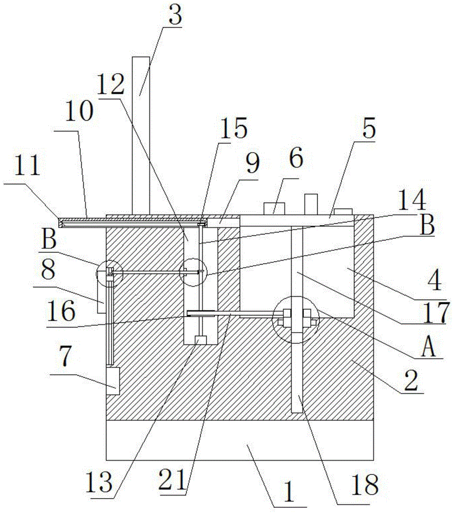 本发明中,凹槽4的底部内壁上开设有圆槽18,圆槽18内滑动安装有圆杆17,圆杆17的顶部与升降板5的底部固定连接,圆槽18内转动安装有环形块19,环形块19与圆杆17螺纹连接,环形块19转动可以使圆杆17竖直移动。In the present invention, a