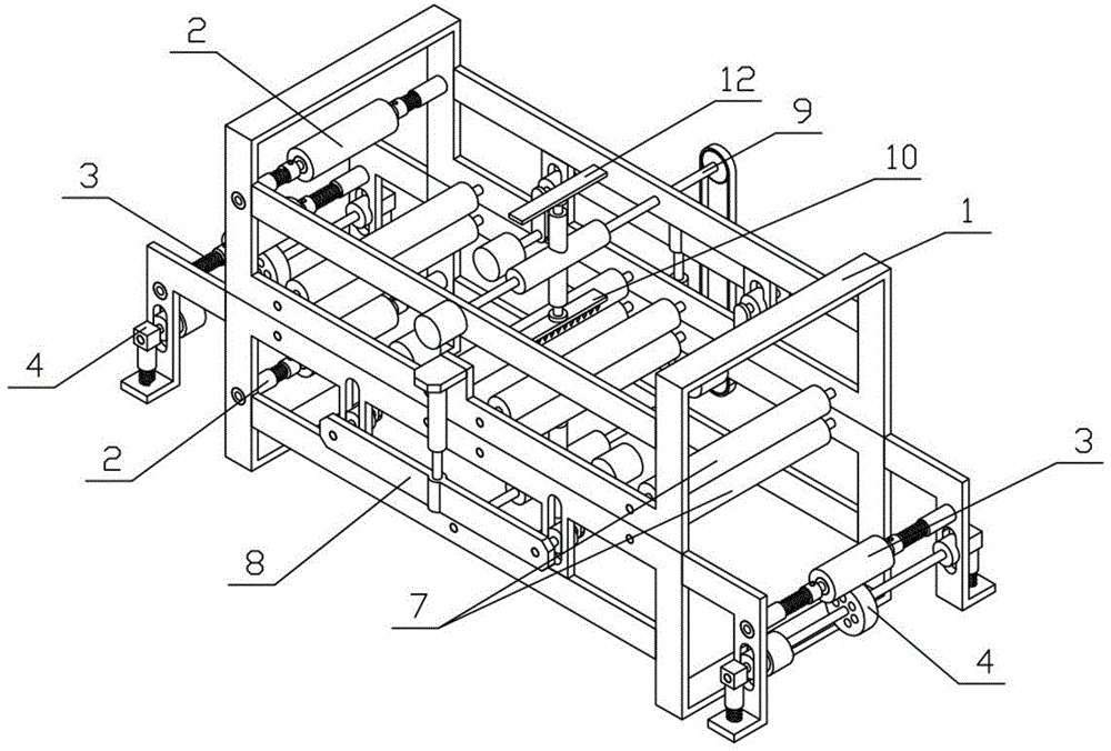 the method comprises the following steps: respectively winding one ends of two plastic films II 14 on a winding mechanism I2, fixedly connecting the other ends of the two plastic films II 14 to a winding mechanism II 3 positioned on the front side, winding one end of a plastic film I13 on a winding mechanism II 3 positioned on the rear side, and fixedly connecting the other end of the plastic film I13 to the winding mechanism II 3 positioned on the front side;