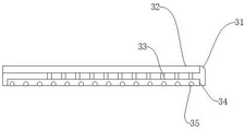 夹紧机构3包括夹紧杆31、夹紧空压座32、夹紧活塞杆33、夹紧活动板34,横移座21下端固定有两个夹紧杆31,横移座21上侧通过升降气缸36连接有两个夹紧杆31,夹紧杆31内侧均设置有夹紧空压座32,夹紧空压座32上设置有夹紧活塞杆33,夹紧活塞杆33一端连接有夹紧活动板34,夹紧活动板34内侧安装有滚轮35;