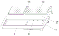 如图1、图2和图6中固定框2横截面内侧的面积尺寸大于床框1横截面内侧的面积尺寸,且固定框2的横截面形状呈“U”字形结构,并且固定框2的内侧壁与第一床板27下端的外侧呈贴合设置,第一活动板7在固定框2的前侧壁上呈等间距设置,且第一活动板7与档杆8呈倾斜设置,并且档杆8通过第一活动板7的翻转在固定框2上构成升降结构,固定杆10与第一陪护床板11采用贯穿的方式相连接,且第一陪护床板11的宽度尺寸小于床框1的宽度尺寸,通过第一陪护床板11和第二陪护床板15的设置,方便给陪护人员提供休息场所,提高了实用性。