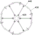 伞式可调节模板机构400,伞式可调节模板机构400包括半径调节组件410、伞式套管支架420、固定钢模板430、活动钢模板440和滑轨450,半径调节组件410设置在升降管320内部,半径调节组件410下侧和伞式套管支架420转动连接,活动钢模板440和固定钢模板430均为弧形板,活动钢模板440内壁和伞式套管支架420转动销接,固定钢模板430一侧通过螺栓和活动钢模板440的一侧固定连接,固定钢模板430的另一侧和活动钢模板440贴合,滑轨450设置在圆盘330下表面,滑轨450具体为导轨和滑轮,滑轮和导轨滑动连接,滑轮为滑轨450的滑动端,滑轨450的滑动端和活动钢模板440的上侧连接。活动钢模板440一侧固定连接有加强肋,用于加强活动钢模板440。