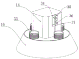 in order to adjust the height of the chip removing cover 16 according to the length of the milling cutter, as shown in fig. 6, the present embodiment is modified from embodiment 1 as follows: the inner wall of one side of the scrap removing cover 16 is connected with the peripheral outer wall of the rotating motor 14 in a sliding manner; the inner wall of the top end of the scrap removing cover 16 is provided with a flexible hose 33; the inner wall of the top end of the scrap removing cover 16 is rotatably connected with a limiting rod 36; a fixed block 34 is fixedly connected to the outer wall of one side of the rotating motor 14; the inner wall of one side of the groove 35 is provided with uniformly distributed grooves 35; the inner wall of one side of the fixed block 34 is connected with the outer wall of the periphery of the limiting rod 36 in a sliding manner; a baffle 37 is fixedly connected to the outer wall of one side of the bottom of the fixing block 34; the height of gag lever post 36 is adjusted through recess 35 on fixed block 34 and the fixed block 34, thereby reach the height that removes bits cover 16 that the regulation is connected with gag lever post 36, thereby adjust the height that removes bits cover 16 according to the length of milling cutter, make remove the absorption sweeps that bits cover 16 both can be thorough, still can not influence the processing of wood carving, flexible hose 33 then guarantees the absorption of sweeps when removing bits cover 16 and remove and handles, baffle 37 then guarantees when adjusting and remove bits cover 16 height, remove bits cover 16 and can not drop, the security of the improvement device.