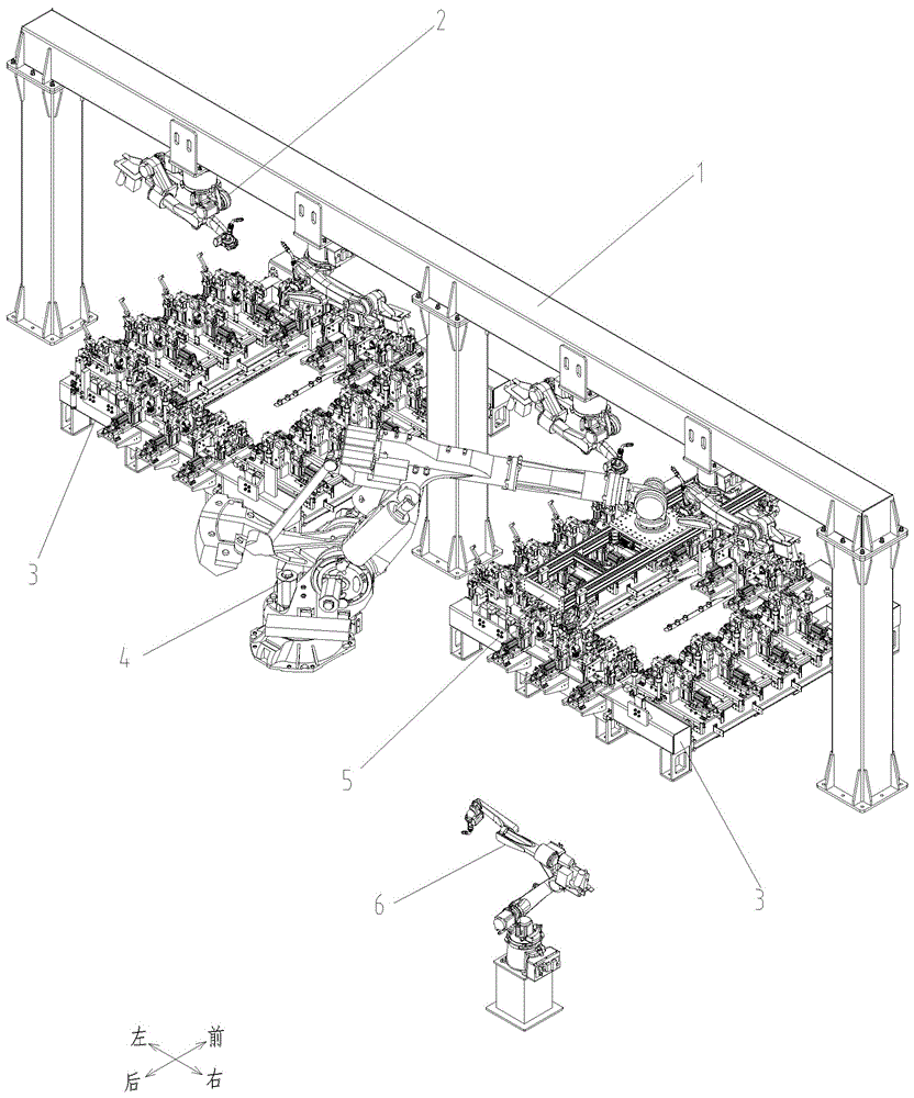 如图1所示,本人防门框自动焊接装置设有一个左右横向布置的焊接龙门1,所述焊接龙门1设有三立柱双龙门位,每个龙门位上各悬挂有两台可沿龙门横梁左右横移且焊接臂可向下伸展的弧焊机器人2;焊接龙门两个龙门位下方各设有一个可适用于多种相同高度不同宽度规格人防门框的框架拼焊平台3,在两框架拼焊平台3的后侧对正焊接龙门中间立柱的位置设有一台回转式多工位抓取机器人4,抓取机器人4的手臂前端连接有一个可调节夹持宽度的抓手组件5;在抓取机器人4的旁侧设有一台补焊机器人6。As shown in Figure 1, the automatic welding device for the door frame of the self-defense is provided with a welding gantry 1 arranged horizontally on the left and right sides. The welding gantry 1 is provided with three-column double gantry positions, and two gantry positions are suspended on each gantry position. Arc welding robot 2 that can move horizontally and whose welding arm can extend downward; a frame welding platform 3 that can be applied to a variety of civil air defense door frames of the same height and different widths is provided under the two gantry positions of the welding gantry. A rotary multi-station grabbing robot 4 is installed at the position where the rear side of the platform 3 is aligned with the middle column of the welding gantry. The front end of the arm of the grabbing robot 4 is connected with a