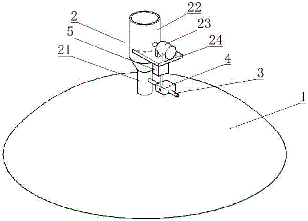 附图标记:1、发酵腔;2、秸秆粉碎机构;21、上料管;211、外管;212、内管;213、凸盘;2131、导流槽;214、凹盘;215、粉碎轴;22、上料斗;221、轴架;222、取料爪;2221、取料杆;2222、爪齿;223、传动箱;224、转动刀盘;225、固定刀盘;23、电机;24、支撑板;3、水管;4、添加盒;5、发酵液腔;51、端口;52、添加轴;521、输水轮;522、桨叶;523、添加轮;5231、添加槽;5232、量板;5233、齿板;5234、齿轮;53、隔板;54、输水腔;55、添加腔。Reference numerals: 1, fermentation chamber; 2, straw crushing mechanism; 21, feeding pipe; 211, outer pipe; 212, inner pipe; 213, convex plate; 2131, diversion groove; 214, concave plate; 215, crushing Shaft; 22, Upper hopper; 221, Pivot frame; 222, Reclaiming claw; 2221, Reclaiming rod; 2222, Claw teeth; 223, Transmission box; 224, Rotating cutter head; 225, Fixed cutter head; 23, Motor; 24. Support plate; 3. Water pipe; 4. Addition box; 5. Fermentation liquid chamber; 51, Port; 52, Addition shaft; 521, Water delivery wheel; 522, Paddle; 5232, measuring plate; 5233, tooth plate; 5234, gear; 53, partition plate; 54, water delivery cavity; 55, adding cavity.