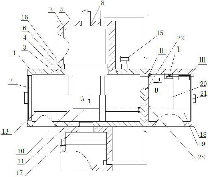 Specifically, the blocking device described in this embodiment is composed of a threaded rod 23 movably mounted on the top end of the other side of the drying box 18, a blocking plate 24, a nut 25, a guide rod 26, and a guide sleeve 27, wherein the threaded rod 23 is in threaded fit with the nut 25 and is all located in front of the blocking plate 24, the rear end of the nut 25 is fixedly connected with the front top end of the blocking plate 24, the guide rod 26 is in sleeved fit with the guide sleeve 27 and is all located behind the blocking plate 24, the front end of the guide sleeve 27 is fixedly connected with the rear top end of the blocking plate 24, the top end of the guide rod 26 is fixedly connected with the inner wall of the top end of the drying box 18, the bottom end of the threaded rod 23 is fixedly connected with the top end of the output shaft of the rotating motor, a supporting plate 28 is fixedly mounted at the bottom end of the rotating motor, and one side of the supporting plate 28 is fixedly connected with the inner wall of the other side of the drying box 19. The backup pad 28 is located the top of drying-machine, and the rotating electrical machines work, and it is rotatory to drive threaded rod 23, threaded rod 23 and nut 25 screw-thread fit, nut 25 and blocking plate 24 fixed connection, uide bushing 27 and blocking plate 24 fixed connection, and through the suit cooperation of guide bar 26 with uide bushing 27, can prescribe a limit to nut 25, make the nut drive blocking plate 24 can only reciprocate, and blocking plate 24 blocks first air vent 22.