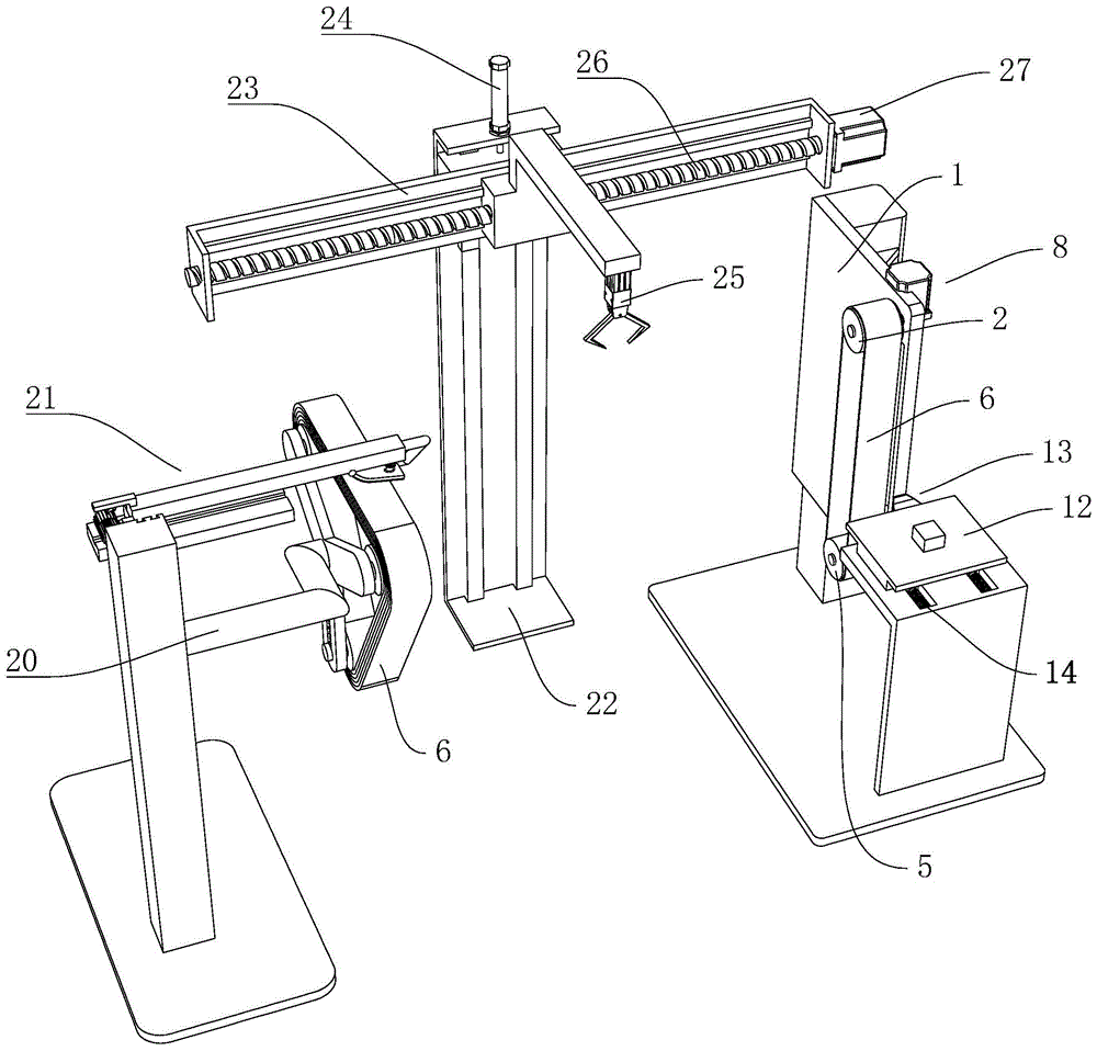 位于机架1的一侧设有用于固定砂带6的张紧架20,将砂带6逐层依次套设在张紧架20上,通过张紧架20的扩张力实现砂带6之间的相互抵紧。张紧架20上设有将砂带6逐个取出的取出装置21,取出装置21与机架1之间设有固定座22,固定座22上设有沿竖直方向往复滑移的移动座23,固定座22上设有驱动移动座23移动的第三驱动件24,第三驱动件24为气缸,气缸的缸体固定设置于固定座22、活塞杆与移动座23固定连接。移动座23上设有在机架1与张紧架20两者之间往复滑移的夹爪25,移动座23上通过轴承转动设置有与夹爪25螺纹连接的第二螺杆26以及驱动第二螺杆26转动的第四驱动件27,第四驱动件27为电机,电机固定设置于移动座23且输出轴与第二螺杆26固定连接。A